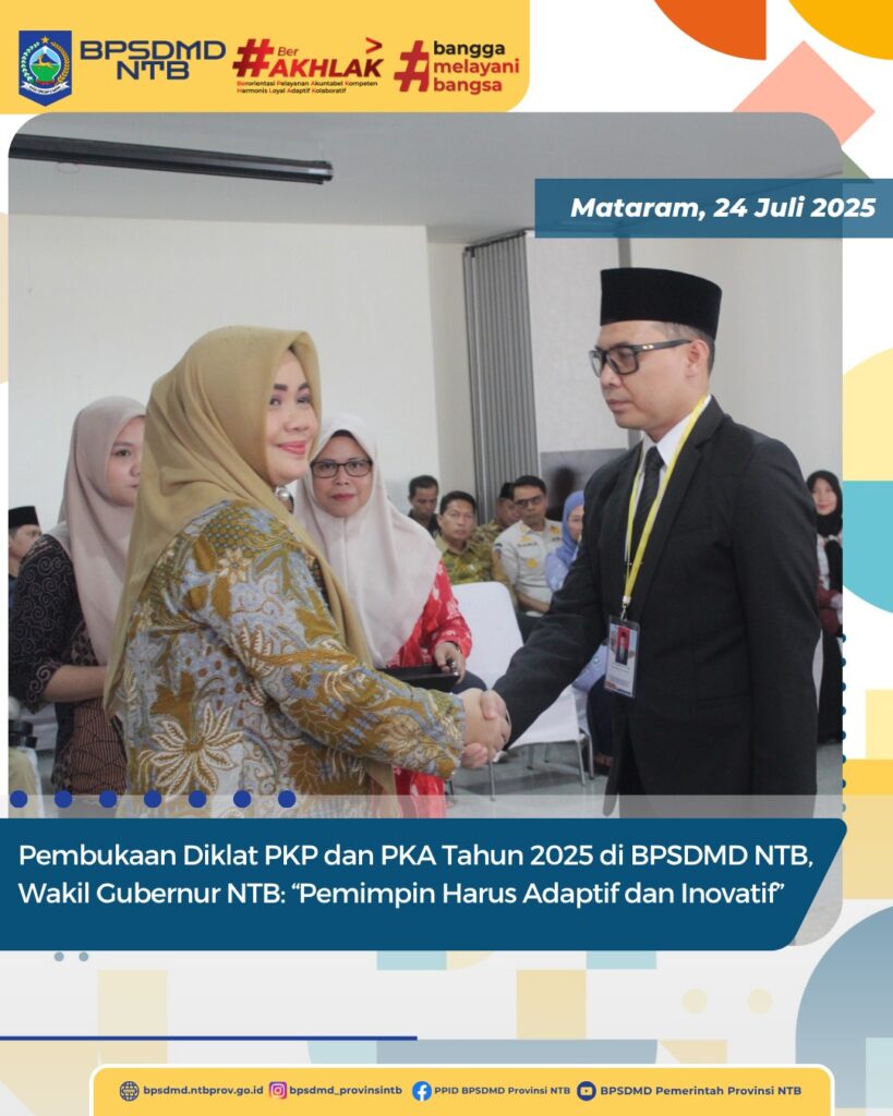 Mataram – Wakil Gubernur Nusa Tenggara Barat Hj. Indah Dhamayanti Putri, S.E., M.I.P. secara resmi membuka Pelatihan Kepemimpinan Pengawas (PKP) dan Pelatihan Kepemimpinan Administrator (PKA) Tahun 2025 yang diselenggarakan oleh Badan Pengembangan Sumber Daya Manusia Daerah (BPSDMD) Provinsi NTB, Kamis (24/07/2025).