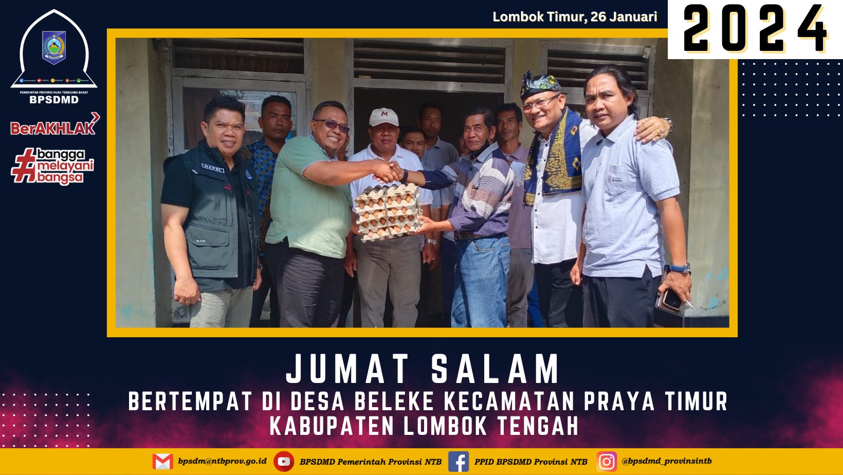 Badan Pengembangan Sumber Daya Manusia Daerah Provinsi NTB yang di wakili oleh Kepala Bidang PKMF H. Muhammad Taufik, S.E., M.M pada Hari Jum’at, tanggal 26 Januari 2024 sejak pukul 09.00 Wita, melaksanakan kegiatan Jumat Salam (Jumpai Masyarakat Menyelesaikan Aneka Persoalan) bertempat di Desa Beleke Kecamatan Praya Timur Kabupaten Lombok Tengah di terima langsung oleh Kepala Desa Beleke, Sekretaris Desa, Babinsa, Babinkamtibmas dan para Kepala Dusun serta Tokoh Masyarakat di wilayah Desa Beleke.