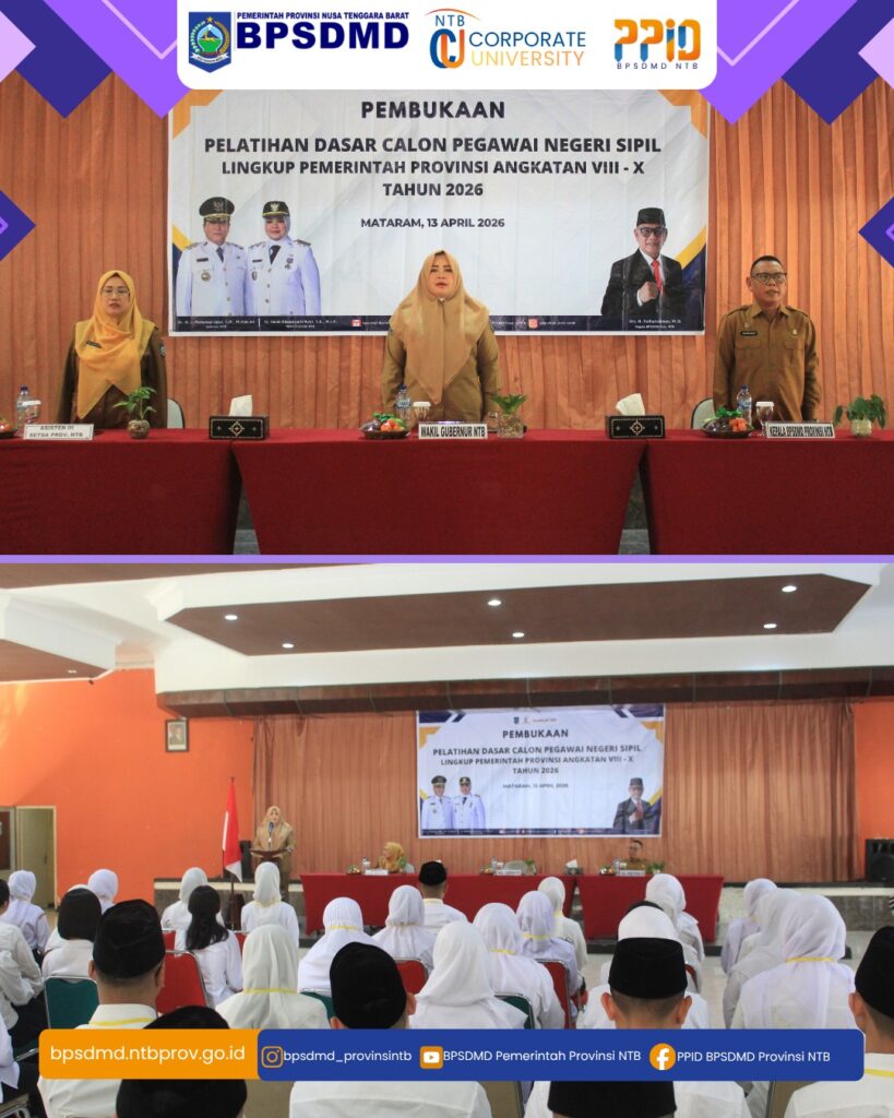Pembukaan Pelatihan Dasar (Latsar) CPNS lingkup Pemerintah Provinsi Nusa Tenggara Barat (NTB) resmi dibuka secara langsung oleh Wakil Gubernur NTB, Hj. Indah Dhamayanti Putri, S.E., M.I.P. Kegiatan ini turut didampingi oleh Asisten III Setda Provinsi NTB serta Kepala BPSDMD NTB, dan dihadiri oleh para Kepala OPD, pejabat lingkup Pemerintah Provinsi NTB, serta Widyaiswara BPSDMD NTB.
